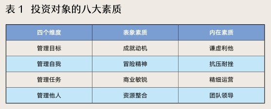 基于对企业家精神、创业者素质和领导者素质的研究总结与提炼,我们搭建了投资对象的素质画像,即投资者要关注创始人的八大素质——成就动机、谦虚利他、冒险精神、抗压耐挫、商业敏锐、精细运营、资源整合和团队领导。