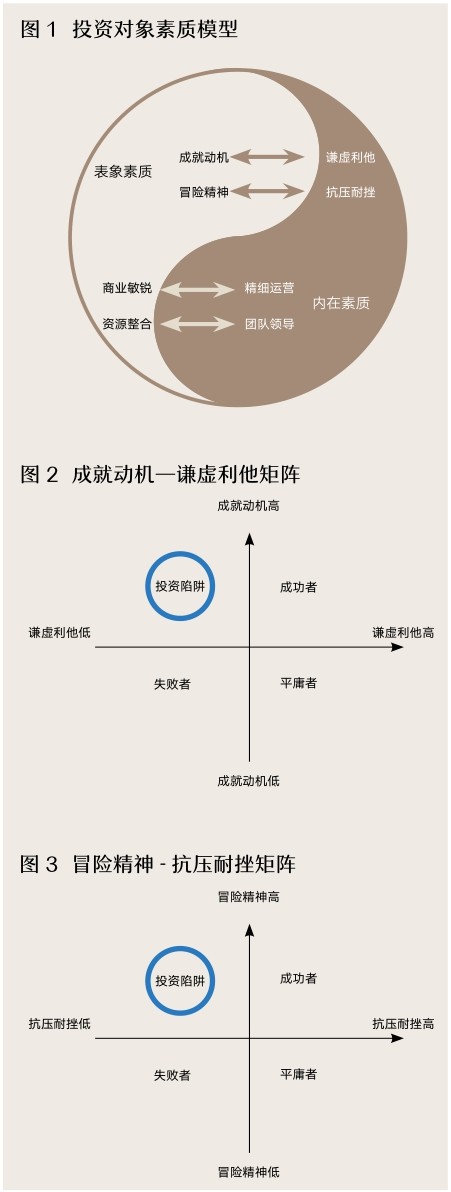 每一組中的两项素质互为二元补充,第一类素质——成就动机、冒险精神、商业敏锐、资源整合,我们将之归为“表象素质”,具备这些特质的创业者非常容易受到投资者的关注和青睐;第二类素质——谦虚利他、抗压耐挫、精细运营和团队领导,我们将之归为“内在素质”。在“表象素质”凸显的情况下,创业者的后一类特质很容易被忽略,但这些特质又是决定投资能否成功的关键。过多看重表象素质,忽视内在素质,是真正的投资陷阱。