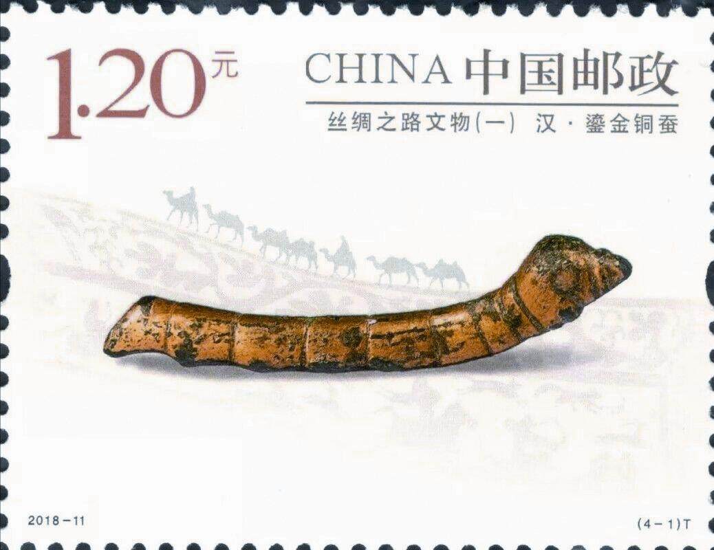 那么,什么样的文物才是丝绸之路最好的诠释呢?按常理来说,丝绸既是主要贸易品,又是商道的名称,应该是最佳选择;然而,先有蚕后有丝,原产于中国的蚕是丝绸原料的来源,加之蚕的形象稳定单一,相较于形式多样、用于交易的丝绸成品更具代表性。或许正是基于这样的想法,《丝绸之路文物(一)》的设计者才将鎏金铜蚕选为这组邮票第一枚上的主体图案。