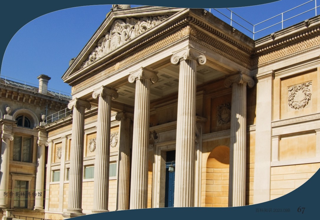1683年6月6日,牛津大学阿什莫林博物馆正式向公众开放。阿什莫林博物馆位于牛津的宽街,其设计者是雕塑家托马斯·伍德。博物馆正门有一对雄伟的科林斯柱支撑着顶端的弧形楣饰,门廊两侧也有成对的科林斯式圆柱。博物馆的建筑风格效仿英国牛津的谢尔登剧院,后者以古罗马的马塞卢斯剧场为创作蓝本。阿什莫林博物馆刚建成时,与现今的外观非常相似。当时,整栋建筑共三层,其中地上建筑为两层,同时建有地下室。博物馆的藏品摆放在二楼,一楼用于讲授化学课程,地下室则设有实验室、化学图书馆和储藏室。