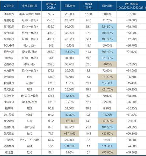 上半年,光伏产业链中有23家上市公司营收超过50亿元。其中16家公司营收同比增长超过20%,9家公司实现净利润同比翻番。