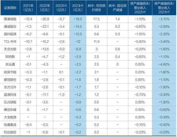 其中,隆基绿能上半年计提了19.9亿元资产减值损失,接近2022年全年水平,其中17.5亿元为存货跌价损失。此外,通威股份、晶科能源、TCL中环、天合光能等头部公司的减值准备也大大增加。