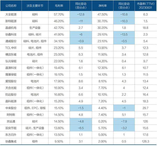 表3:2023上半年光伏生产四个主要环节上市公司盈利能力及市盈率