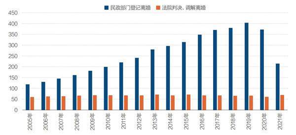 2023年3月底,江西省高级人民法院发布全省法院家事審判数据,2018年至2022年,江西离婚纠纷案件数量占家事案件的85.16%,离婚后财产纠纷案件占2.1%,离婚案件主要呈现案件数量常年高位运行、起诉离婚者年龄年轻化、女性起诉离婚数量多等特点。