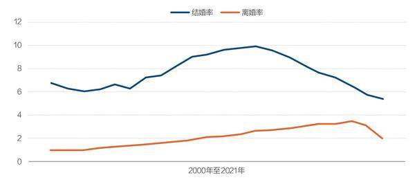 图2:中国近20年结婚率和离婚率变化(‰)
