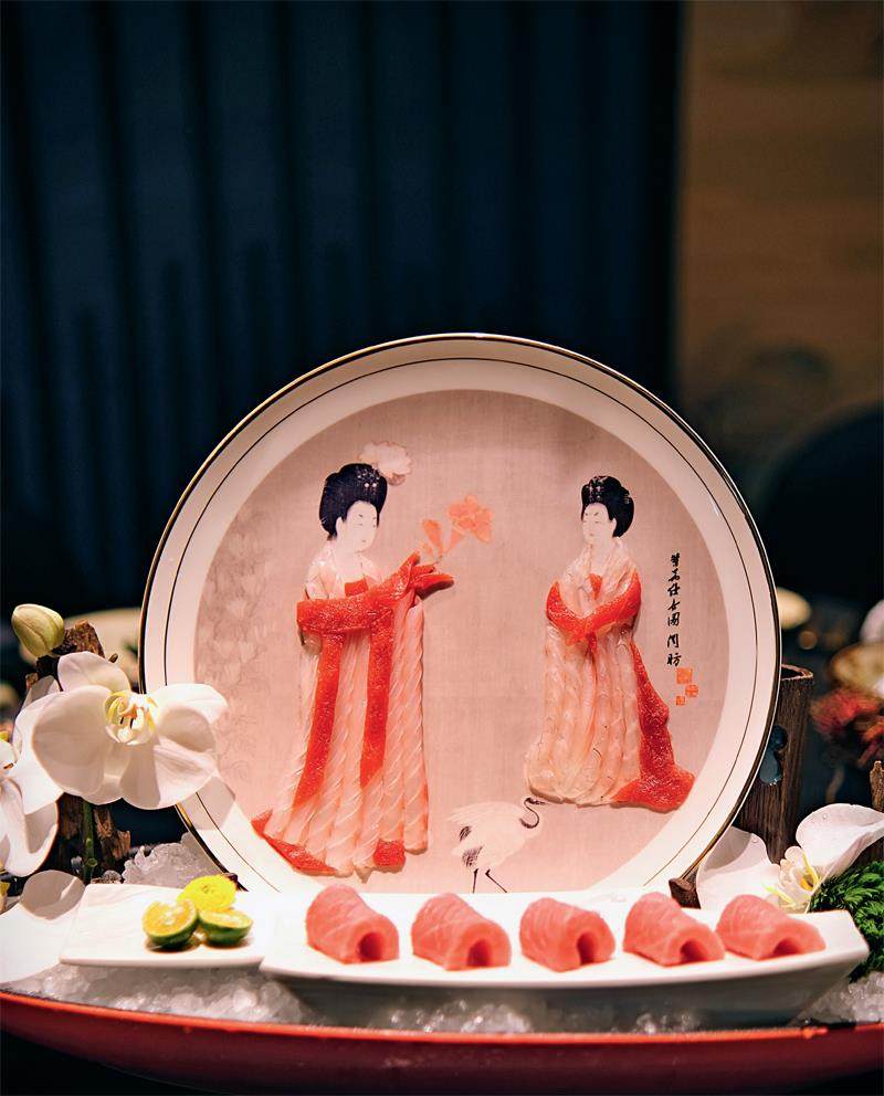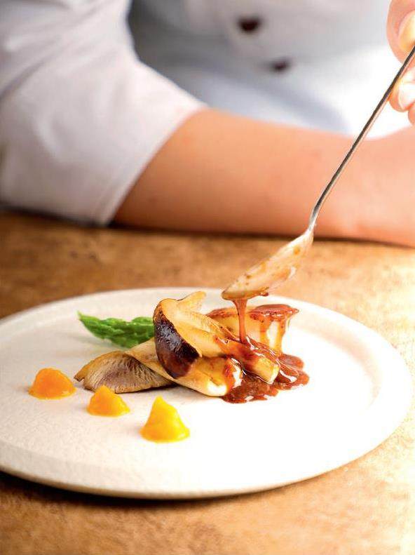 将四大名菌之一的鸡油菌与新鲜三文鱼巧妙融合,塞入烤好的蛋卷中,点缀上来自千岛湖的鲟鱼子酱,让整道菜的味道层次更立体,口感丰富多层次,香脆爆棚。