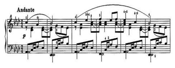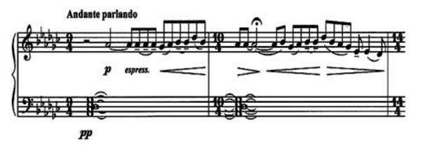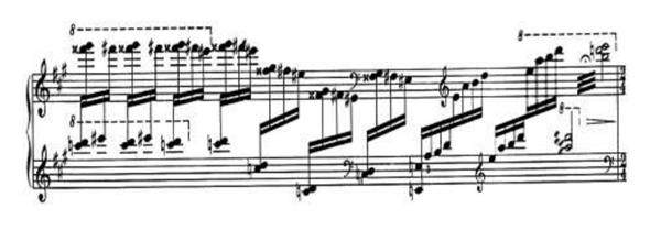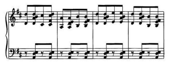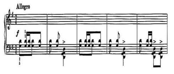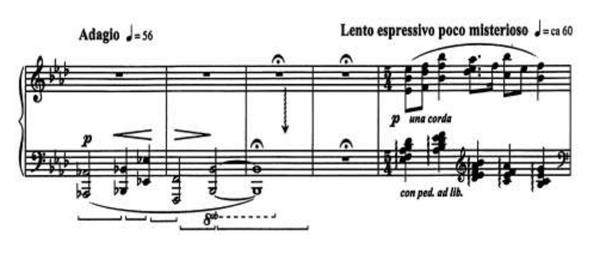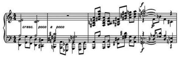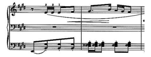 由于三度叠置结构和弦在西方音乐理论体系中无可争议的基础地位,因此以上关于五声性和弦的论述,大多是围绕着非三度叠置结构或三度叠置结构展开的。音乐学家们只是从不同的角度出发去构建不同的体系,至于在创作实践中,究竟是以哪种和弦结构为主,并不需过于教条的计较,只要能取得较好的音响效果。基于目前民族和声学的研究与中国钢琴作品创作实践现状,本文将五声性和弦结构划分为“三度叠置和弦的五声风格化处理”与“非三度叠置结构和弦”两大类进行研究。