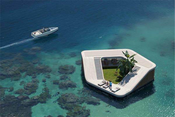 浮动别墅坐落在马尔代夫周围泻湖的大片保护区,利用各种现代技术,包括太阳能电池、机载废水处理和水生产设备,提供与陆地度假酒店无差别的高端体验,唯一明显的区别是强风时会轻微摇晃。