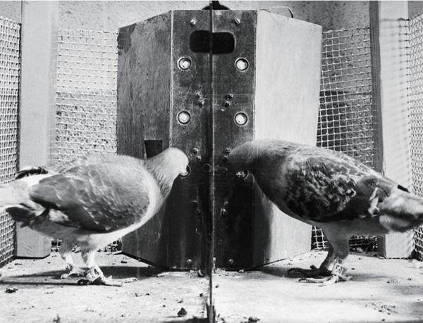 实验中,一只饥饿的鸽子被放到这个实验装置里,鸽子东啄西啄时误打误撞碰到了按钮,结果鸽子最喜欢的玉米粒就蹦了出来。这下鸽子高兴了,突然意识到食物跟按钮之间好像存在着什么联系,于是鸽子啄按钮的行为就开始显著增加。很快,鸽子就学会了它天生不可能会的一个行为——啄按钮。