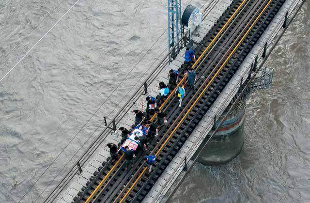 8 月2 日,受困列车旅客在救援人员帮助下徒步赶往转运客车(无人机照片)。新华社记者 张晨霖 摄