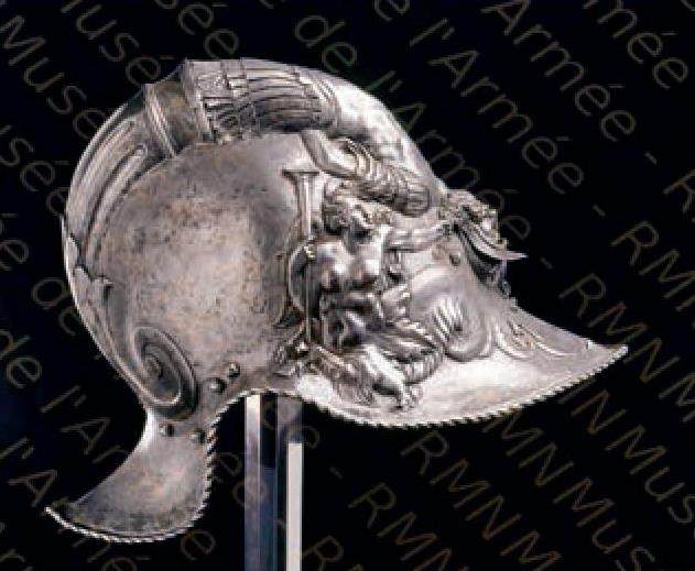内格洛里家族制作的盔甲,多以复古手法采用浮雕形式,再现传统古罗马艺术风格,他们的客户多为王室贵族。留存于世的作品不超过20 件,本博物馆收藏有5 件。这件勃艮第头盔是菲利波·内格洛里和胞弟弗朗切斯科·内格洛里联手打造,通过浮雕装饰在盔顶塑造了一位古代战士的形象,战士的下肢为鞘形,融入刺桐叶中,上面刻有一句希腊语铭文,意思是:“借助于它们,我奔向星辰”。