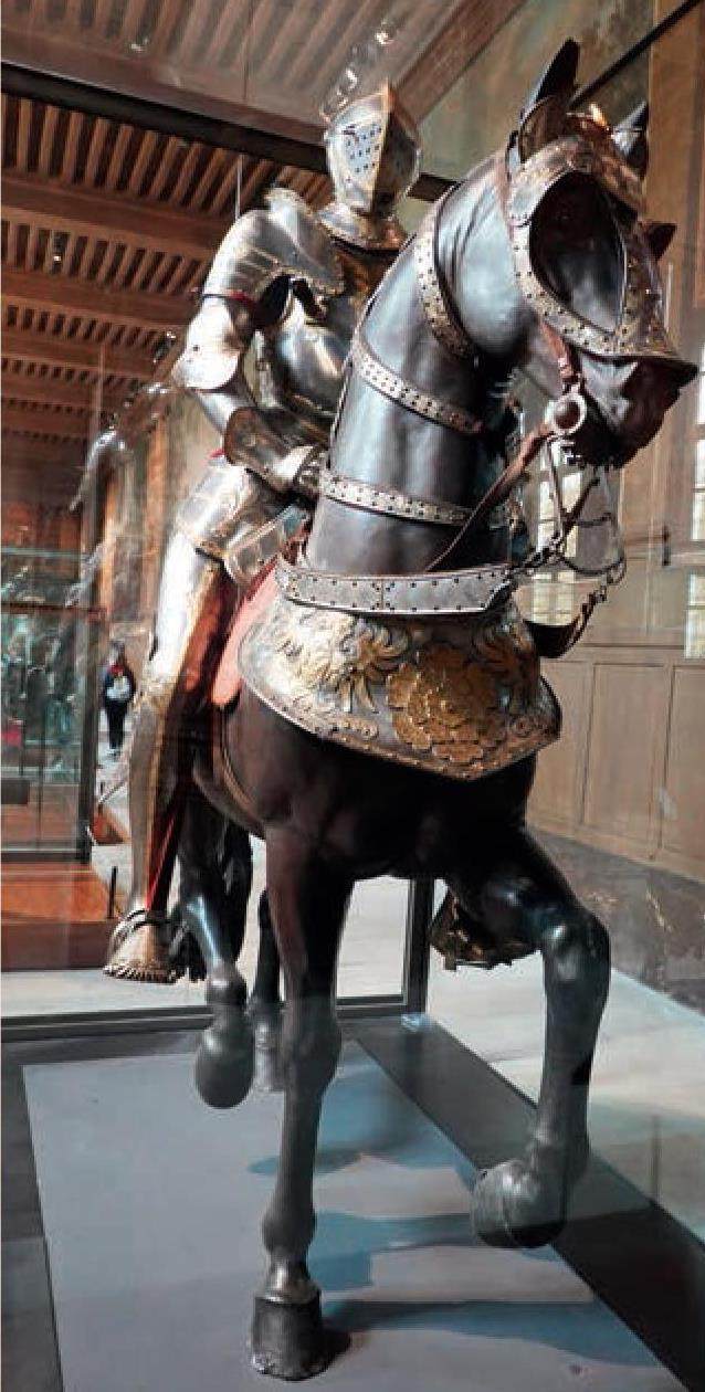 这套人马组合盔甲, 制作于1539 ~ 1540 年,是时任匈牙利和波希米亚国王、奥地利大公斐迪南一世为法国国王弗朗索瓦一世制造。斐迪南一世是西班牙国王查尔斯一世、神圣罗马帝国皇帝查理五世的弟弟(1531 ~ 1556 年与兄长共治)。1556 年查理五世因病宣布退位,其庞大的帝国被一分为二,弟弟斐迪南一世继任神圣罗马帝国皇帝,儿子腓力二世则继位西班牙国王。