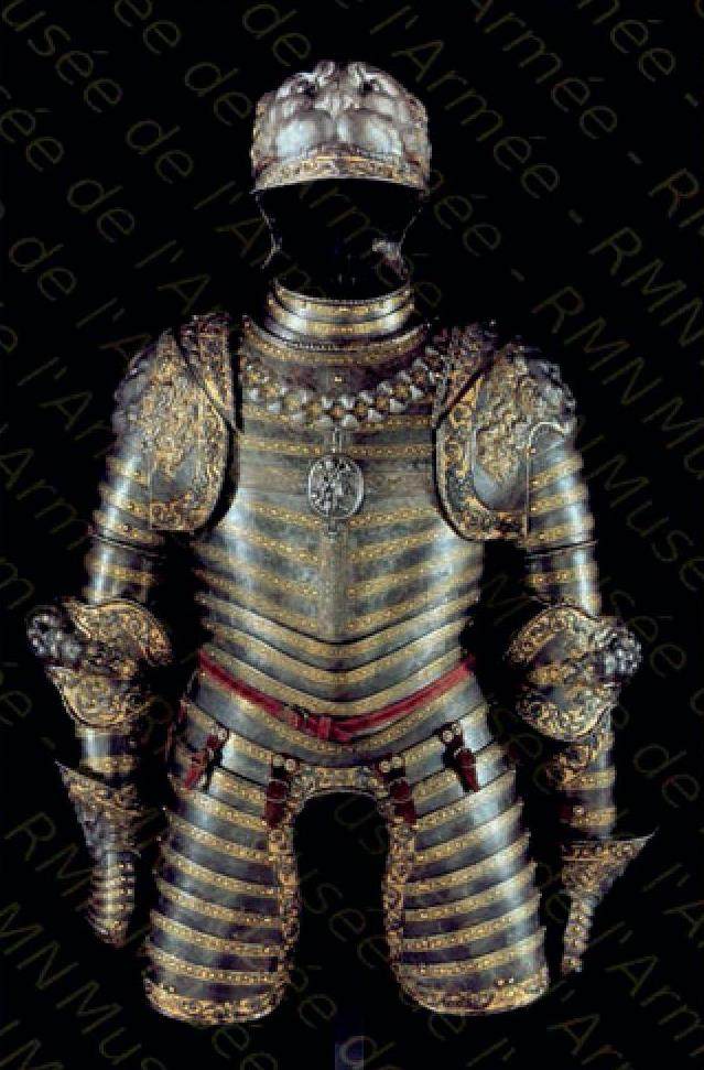 斐迪南一世为法国国王弗朗索瓦一世制造的这套盔甲,缘于意大利战争第6 阶段“ 尼斯休战协议”的签订。自意大利战争爆发后,法国与神圣罗马帝国之间的激烈冲突持续不断,1538 年在教宗的调停和压力下,双方就萨伏依和米兰归属问题达成妥协,并签订了“尼斯休战协议”。为了表达和解诚意,斐迪南一世决定向法国国王弗朗索瓦一世赠送一套盔甲。1539 年7 月,他指令因斯布鲁克最著名的盔甲工匠约尔根·瑟森霍夫(JörgSeusenhofer)前往巴黎为法王量体裁衣,之后根据皇室的一系列指令加紧制作,大约在1540 年年底前制作完成。这套组合的多重盔甲,包括战斗盔甲、马术盔甲、比武盔甲和障碍赛盔甲,造型精美,制作精良,采用蚀刻、镀金、浅浮雕等多种工艺雕饰了象征法国王室的鸢尾花和当时流行的矫饰主义风格的卷叶图案。然而,这件盔甲在制作完工后并没有按照原计划赠送给法国国王,原因是两国关系再度出现裂痕,重新进入敌对状态。之后,这套盔甲被存放于因斯布鲁克附近的安布拉斯城堡军械库。1806 年 2 月 15 日(拿破仑战争期间),拿破仑麾下的高级军需官维勒曼西伯爵(Comtede Villemanzy)发现并带走了这套盔甲及马盔甲,连同其他9 件法国王室的盔甲一同带回了巴黎。