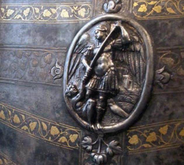 “ 狮子盔甲” 产地米兰,1540 ~ 1545 年制作,是一件“伟大的风格主义”(Grand Manner)经典作品。“Grand Manner” 这个术语最初用来形容米开朗基罗的英雄史诗灵感,后来指16 世纪中期米兰兵器盔甲制作者的制作风格,这种新潮流以米兰内格洛里家族工坊为代表,他们试图重现古代战争用品中的杰作,在盔甲造型艺术和装饰形式上进行创新,特别是在头盔、肩部、肘部和手部采用压印高浮雕狮子图案,并通过镶嵌金银的方法使之更加突出了传统的雄狮主题,展现了男性的阳刚之美,尽显君主的英雄气概。