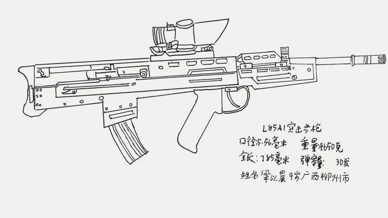 梁以晨同学(9 岁),来自广西壮族自治区柳州市,是《轻兵器》杂志小读者,已经阅读《轻兵器》累积10 本,受到杂志栏目的启发,于是画了这幅L85A1 突击步枪的右视图。