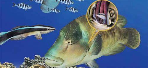 裂唇鱼是海洋界有名的“鱼医生”,体长约 14厘米,生活在珊瑚礁上。它天生的本领就是在各种病鱼身上捕食寄生虫,帮助病鱼清除身上的污垢。只要鱼医生一出来,病鱼们都会温驯地让鱼医生在自己身上捕捉寄生虫,而且还会张开大口和鳃盖,让鱼医生进入口腔或鳃腔里捕虫和清除污物。