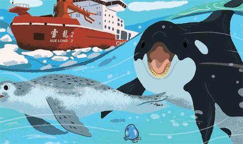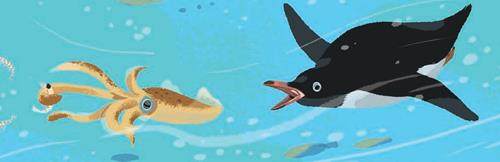 在极地观光之旅中,小水滴看到了许许多多的生物为了生存下去而奔波、战斗的场景,其中一幕令它印象深刻:一大群磷虾优哉游哉地取食着水中的藻类和有机碎屑。突然,一只乌贼疾速冲入磷虾群,以迅雷不及掩耳之势伸出两条长长的腕足捕获了一只个头儿最大的磷虾。还没等乌贼继续将“魔爪”伸向其他磷虾,又有一只阿德利企鹅闪电般地冲了过来,用尖喙死死地夹住了乌贼,然后一扭头,将乌贼吞入了腹中。螳螂捕蝉,黄雀在后,正当阿德利企鹅心满意足准备返回时,又有一个庞大的黑影疾速逼近,原来是一头豹海豹。只见这头豹海豹张着大嘴,露出满口的尖牙利齿,瞬间就咬住了阿德利企鹅,无论阿德利企鹅如何奋力挣扎也无济于事,一番撕扯后,阿德利企鹅成了豹海豹的一顿美食。然而,捕食还在继续,远处快速接近的一群黑白身影引起了豹海豹的警觉,小水滴一眼就认出了那是它见过多次的海洋霸主——虎鲸。恐惧慌张的豹海豹快速游向不远处的一块浮冰,纵身一跃趴在了浮冰上试图躲避来自水中的追击,但饥饿的虎鲸们可不打算放过这头已经吃饱的豹海豹。领头的虎鲸首先从水面探出头来观察冰面上豹海豹及其周围环境,随即召集虎鲸群整齐地排成一行,一齐从浮冰下快速穿过,虎鲸群经过时激起的水浪瞬间就把脆弱的浮冰击碎,可怜的豹海豹无奈落入水中,此时虎鲸们一拥而上,无处可躲的豹海豹瞬间被饥饿的虎鲸们撕成了碎片……小水滴不禁感慨,吃与被吃是海洋生物永恒的主题,每种生物为了生存都拼尽全力,就算是虎鲸这样的顶级掠食者也要为填饱肚子而想尽办法,因为没有猎物会主动送到嘴边。