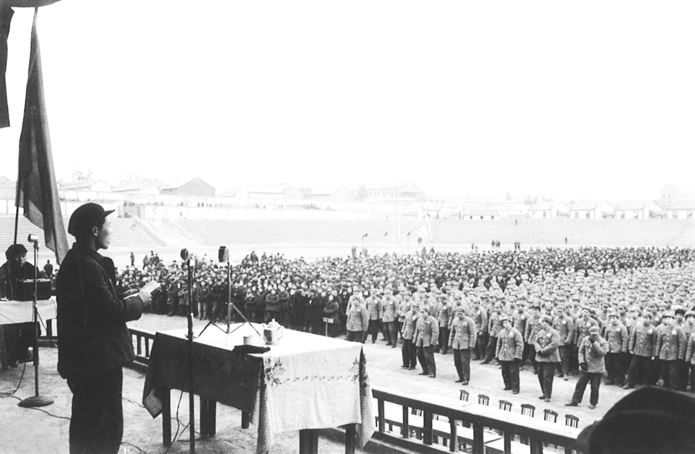 1956年冬,在杏花岭体育场召开的军民联欢大会上,我作为太钢工人代表发言,号召大家学习人民解放军攻坚克难的精神品质,发扬工人阶级艰苦创业的精神,军民携手建设强大的社会主义国家。