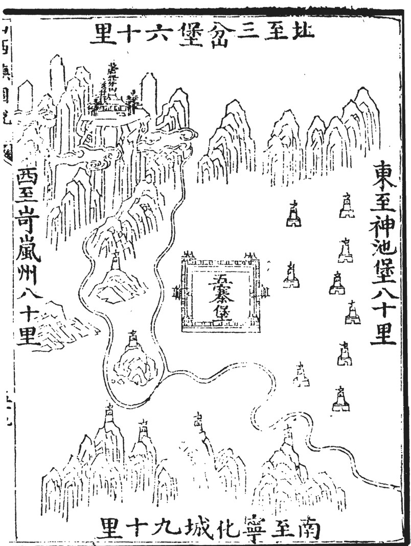 据《宣大山西三镇图说》记载,五寨堡即镇西五所屯牧处,故名五寨。“镇西”之“镇”,指明长城军镇中的山西镇。五寨堡属山西镇岢岚道的西路,土筑于明嘉靖十六年(1537年),万历八年(1580年)包砖,周长四里,高三丈五尺。五寨堡防卫范围里没有边墙,“止管火路墩一十二座、砖楼三座,所领见在旗军五百四名,马、骡四十匹、头”。最初这里驻守的武官为守备,后来降级,改设防守一员。但问题也随之而来,因为这里“四野平旷,居民蕃滋,素为虏所垂涎。未款前虏入,北由水泉、西由河保、东由宁武,咸于此屯兵,四出抢掠。矧逼连芦芽山丛木茂林,土寇易于啸聚。外患内忧均当防范,乃仅以一防守畀之,恐缓急无济于事,议者欲仍设守备,衙门原有故址,不烦重建,公禀取之堡税,不费加增,一调剂间,而于地方之御虏、弭盗两得之矣”。这段文献指出了五寨一带交通便捷、草木茂盛的区位条件。隆庆议和之前,蒙元骑兵从北面的水泉堡、西面的河保营、东面的宁武关侵入明朝疆域,在五寨肆意掳掠。除了外患还有内忧,五寨的四周山高林密、盗匪猖獗。所以这一带的军事防卫责任着实重大,需要重新调高防卫等级,增加更多驻军,才能更好地抵御外敌、治理匪盗。