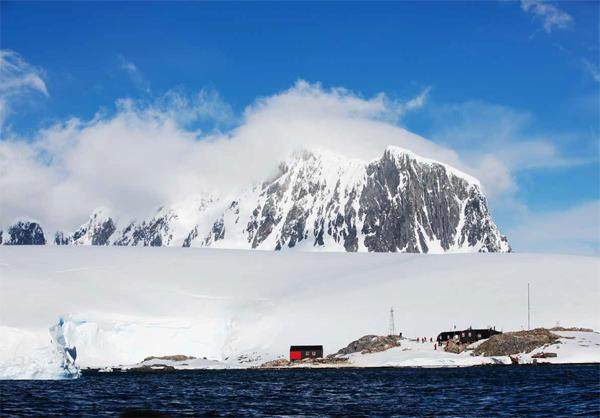 拉克罗港位于古迪埃尔岛上,这个天然海港于1903年被法国南极探险队发现。拉克罗港的“好人缘”还在于这里壮观的风景:小岛背倚连绵起伏的雪山,一条“玉带云”缠绕在山腰上,白云缭绕,雪山下面条条冰川汇聚在岸边,远看就像是在海边筑起了一道大坝。