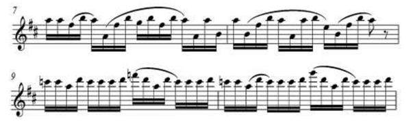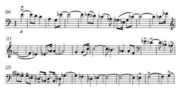 中国传统音乐调式与旋法的娴熟运用,是徐文正教授音樂创作的一大特色,也是其作品民族性的重要体现。如女中音独唱《游子吟》、歌剧《未了情》中的《告别二重唱》唱段、钢琴与单簧管合奏《戏》《第一弦乐四重奏》等作品,就充分运用了中国古代的雅乐七声调式(正声音阶),并结合中国传统的旋律发展手法,使作品不仅具有古色古香的味道,还展现出了强烈的民族属性。同时,这些作品在旋律发展过程中,也恰当借鉴了现代作曲技术,增加了旋律的新颖性,营造出一种“既熟悉又陌生”之感。如《第一弦乐四重奏》,其核心动机来源于河北梆子中颇具代表性的唱腔。通过对旋律线条基本旋法、核心音程、核心节奏、鱼咬尾发展手法的强调和突出,结合无调性、泛调性以及音程、节奏的扩大与缩小等作曲技术的运用,使得传统与现代巧妙融合、互为表里。“既熟悉又陌生”的旋律进行,顺畅自然又不落俗套,产生出一种“情理之中、预料之外”的新颖听觉感受,这充分体现出徐文正教授在旋律发展中的创造性探索。谱例1是此作品中大提琴的一段旋律,从中可以看出这种手法的运用。