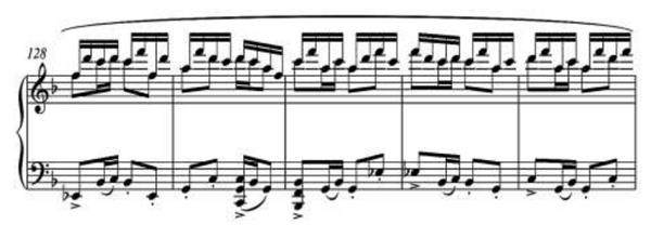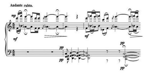 中国传统音乐中,“加花变奏”是旋律发展的重要手法之一。作曲家创造性地将此手法运用于作品的纵向布局,在多调性旋律纵向叠置的同时,旋律层采用“加花变奏”的手法,既增加了旋律的表现力,又因声部之间调性与形态的差异,形成了层次鲜明的纵向结构空间。使多调性音乐的现代性与线性思维的传统性,达成有机的融合与统一。如钢琴组曲《畲寨风情》第四首《舞曲》的中段,低音部是f商的旋律,高音区则奏出该旋律在g商上的加花变奏。同一特质的旋律,由于调性与形态的改变,在纵向的结合与横向的行进过程中,产生出一种既对立又统一的奇妙的音响组合。恰似传统与现代的矛盾双方,在统一与斗争中,推动着音乐的运动、发展与变化。此或是作曲家将“对立统一”原则,运用于旋律发展中的创造性实践。见谱例5。