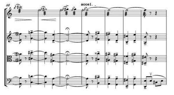 作品《第一弦乐四重奏》则是这种手法更为深入而复杂的运用。如谱例4中,第二小提琴、中提琴、大提琴形成六个调的音块式叠置,就像并置六把不同颜色的硬毛刷,在同向运动中画出的一道色彩斑斓、蜿蜒起伏的声带。旋律在同向而行的碰撞过程中,创造出一种奇特的音响色彩,极富艺术感染力。