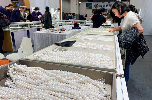 在一处珍珠展台,周围聚集着不少客人。只见珍珠就如超市里的大米一样,一把一把堆在展台上。当记者向工作人员提出想看某种点位的珍珠项链时,工作人员将一大把项链“哗啦”一声放在桌布上,“您随便挑啊,还有亮度更好的”,说完,又拿出了一大把项链。