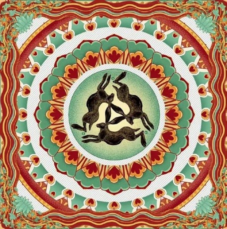“三兔共耳”是发现于敦煌莫高窟中的壁画,画师巧妙地利用兔子耳朵之间的借用与被借用关系,仅利用三只耳朵组成为近似等边的三角形,以“三耳”表“六耳”,使观赏者无论从哪个角度来看,每只兔子都有两只耳朵,营造出三只兔子相互奔跑追逐、循环往复的动感画面(图1)。