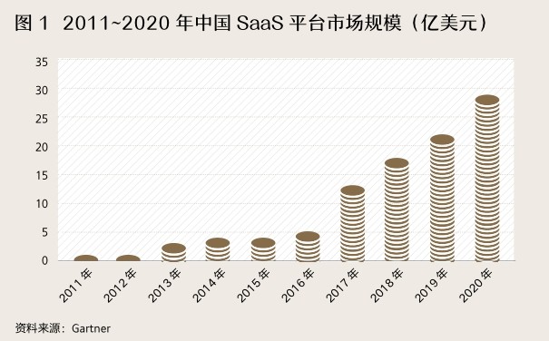 从美国市场发展的规律看,中国企业也在向美国市场的竞争态势演变,在当下竞争越来越激烈、市场趋于饱和的情况之下,软件企业和数字化 SaaS 行业将会是新的经济增长点。如图1所示,中国SaaS平台在2015~2020年5年间的年均复合增长率(CAGR)达到49%。随着中国企业数字化进程的加速,未来可能会迎来中国软件行業发展最好的十年。