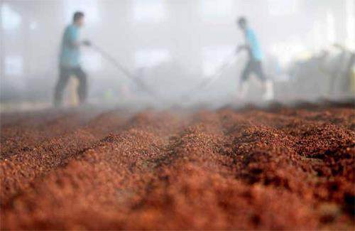 10月31日,在宽城县一家酒企的酿酒车间,工人进行摊晾作业。琢酒酿酒技艺是河北省承德市非物质文化遗产。深秋时节,承德市宽城满族自治县的白酒企业按照非遗技艺要求,酿造酱香型白酒,厂区内弥漫着浓郁的酒香。新华社发(王立群摄)