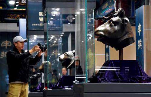10月20日,观众在“五首重聚·故园新语”圆明园兽首铜像特别展览上拍摄。10月18日,由保利艺术博物馆收藏的圆明园十二兽首之牛首、虎首、猴首、猪首铜像,与在2020年12月1日正式回归圆明园的马首铜像一起,亮相“五首重聚·故园新语”圆明园兽首铜像特别展览,这是自1860年英法联军火烧圆明园后,五兽首首次重聚圆明园。新华社记者罗晓光摄