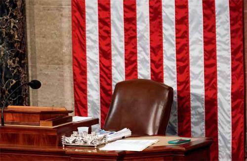 10月18日,这是在美国华盛顿国会拍摄的众议院议长座位。美国国会众议院18日举行议长选举第二轮投票。此前获得共和党党内提名的众议院司法委员会主席、右翼保守派议员乔丹在本轮投票中依然未能获得足够票数当选,众议院继续处于“群龙无首”的混乱状态。新华社发(亚伦摄)