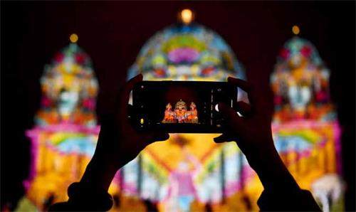 10月6日,在德国柏林,一名游客拍摄被灯光点亮的柏林大教堂。2023年柏林灯光节于10月6日至15日举行。灯光节期间,柏林市内多个地标和建筑物将被灯光和装置艺术品装饰。新华社记者任鹏飞摄