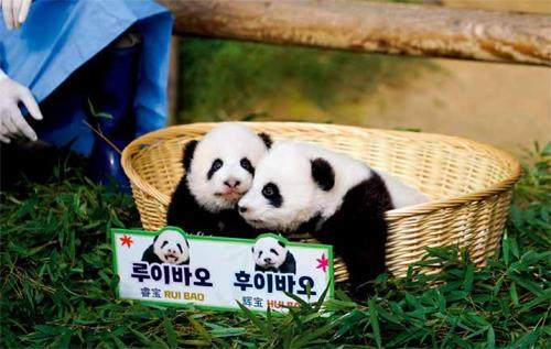 10月12日,在韩国京畿道龙仁市,大熊猫双胞胎幼崽“睿宝”(左)与“辉宝”亮相。当日,旅韩大熊猫“爱宝”“乐宝”的双胞胎幼崽首次与公众见面。双胞胎幼崽的名字“睿宝”“辉宝”也同时公布。新华社发