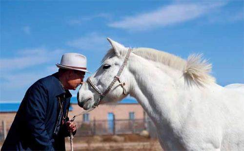 10月16日,内蒙古自治区鄂尔多斯市鄂托克旗91 岁老人明安宝低头亲吻自家的马匹。新华社记者 王楷焱 摄