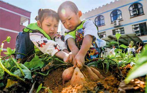 10月16日,湖南省永州市道縣城东幼儿园的小朋友在体验采收红薯。新华社发(蒋克青 摄)