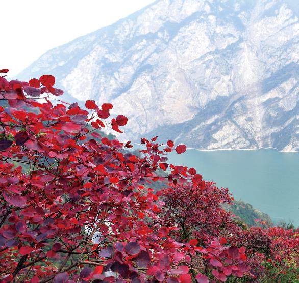 11月26日,船舶行驶在长江三峡西陵峡湖北省宜昌市秭归县水域。初冬时节,长江三峡西陵峡湖北省宜昌市秭归县沿江两岸红叶似火如霞,与一江碧水交相辉映,美不胜收。中新社发 王辉富/摄