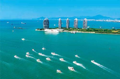 11月27日,海南省三亚湾海域,众多游客乘坐游艇驰骋海面,体验亲海乐趣。