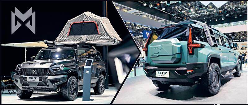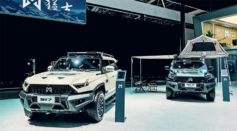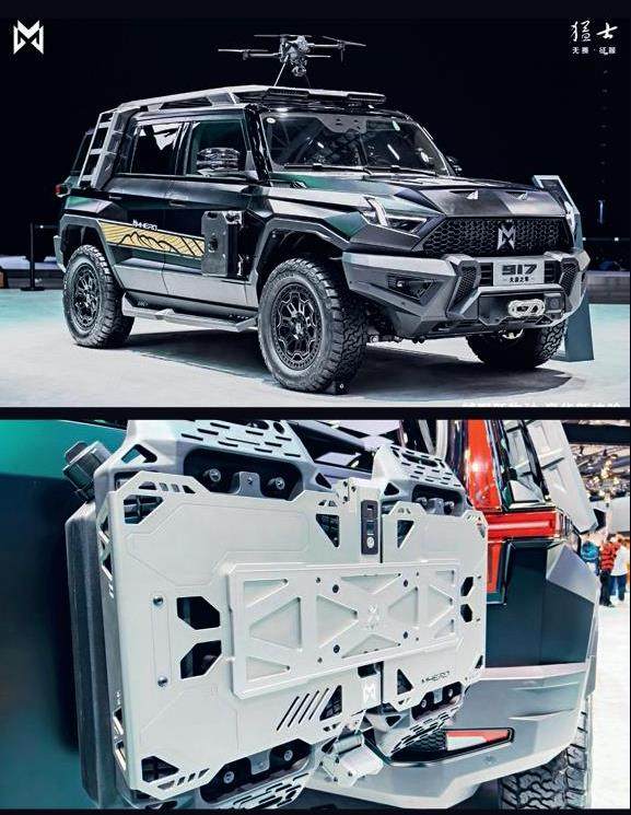 本次车展猛士917共展出5款猛士917,分别为搭载周末勇士、沙漠之隼以及荒野之城三款官方选装套件的展车,以及两款选用官方改色方案的车型。