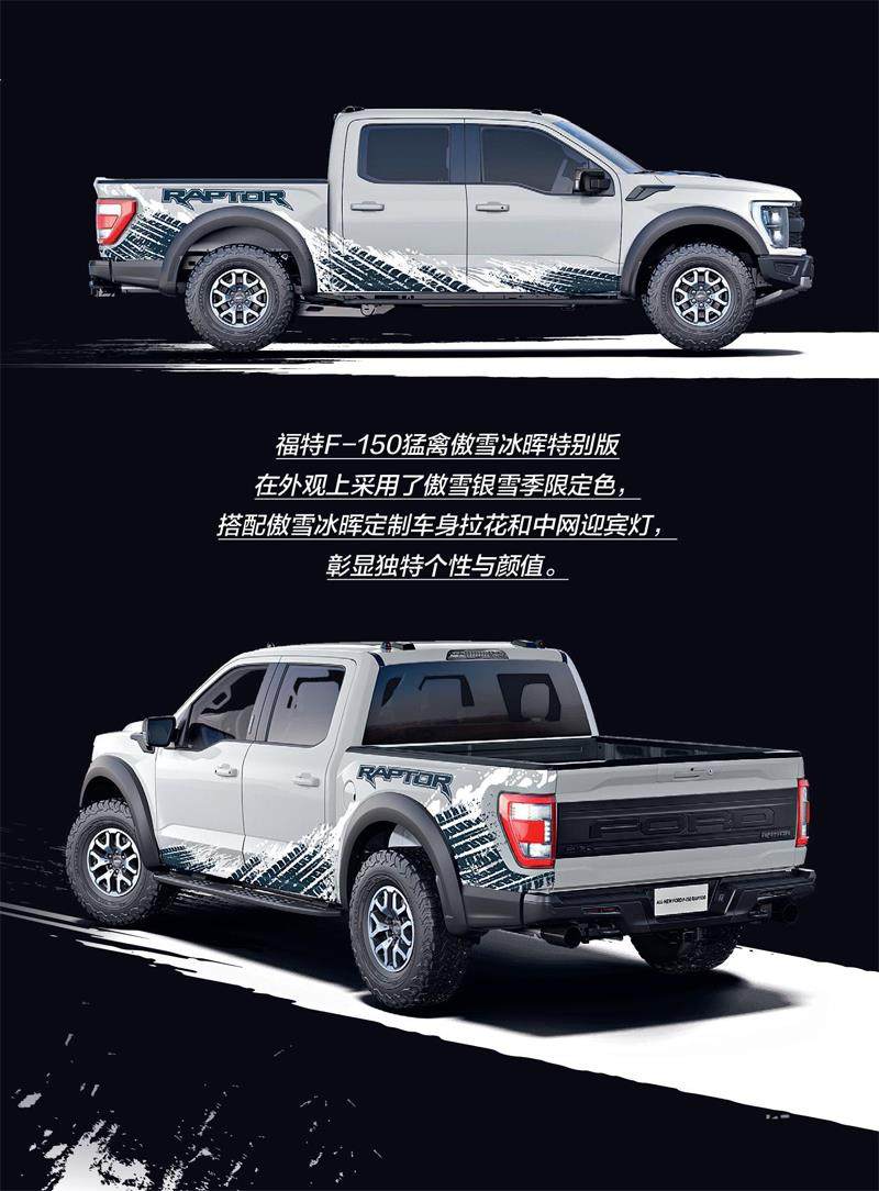 为进一步满足中国用户日益增长的个性化用车需求,本次车展福特纵横推出专为极致雪地越野与极限雪上运动爱好者打造的全新一代福特F-150猛禽傲雪冰晖特别版,官方售价72.58万元,限量发售200台。