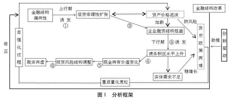 图1展示了本文分析框架,基于该框架的研究思路如下:首先,阐述金融结构偏向性如何在经济上行期诱发企业融资结构扭曲(①→②),并分析融资结构扭曲如何在经济下行期导致更高的债务积压水平以及债务积压如何非线性影响脱实向虚进程(③→⑥),从而构建出从“金融结构偏向性→融资结构扭曲→债务积压→脱实向虚”的完整传导机制。其次,论述货币政策在防风险和稳增长上的两难困境以及由此带来的脱实向虚自强化效应(图1中由虚线连接而成的闭环),在此基础上阐述金融结构改革是如何对自强化产生抑制作用的,从而为改革提供逻辑。最后,分析金融结构改革的风险以及从创新驱动出发化解改革风险的路径,并以金融结构改革为视角,为如何修正实体经济脱实向虚提供具体政策建议。