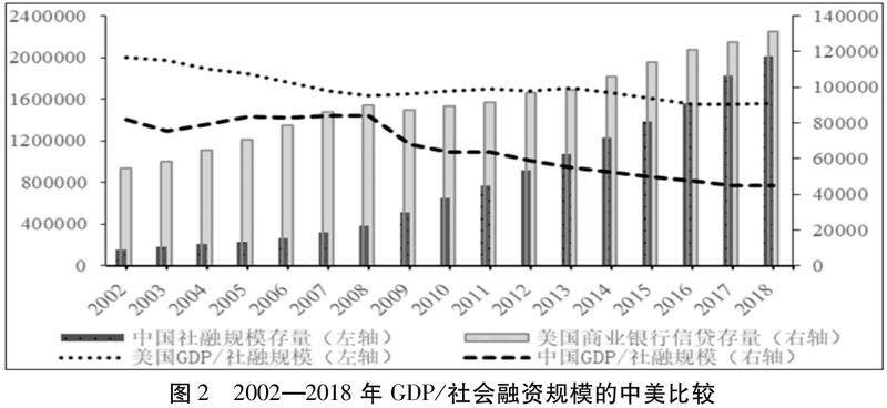 图2对比了中美2002—2018年间的社会融资规模以及“GDP/社融规模”的变化,②后者代表了一个单位的融资额能对应多少新产值。该值越低,说明信贷对新增产值的拉动作用越弱,即更多的贷款被用于承接存量资产。图2显示,2008年后,我国信贷对新增产值的拉动能力出现了明显下滑。