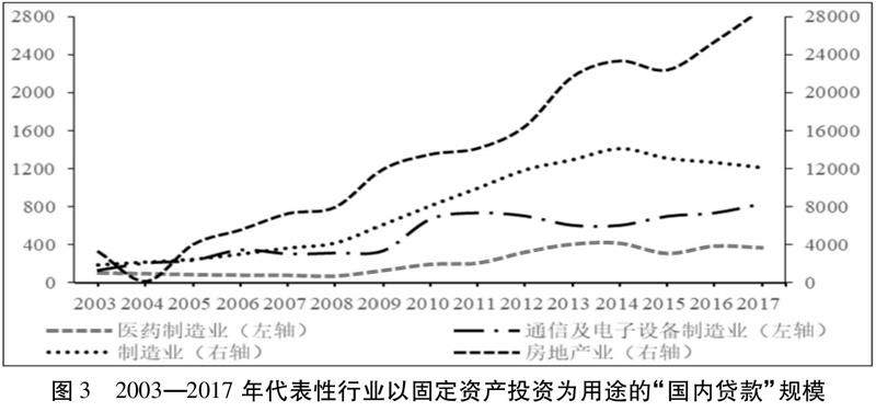 圖3统计了代表性行业以固定资产投资为用途的“国内贷款”规模。结果表明:大量信贷资金被用于对接存量资产投资(房地产业)及低效率投资(传统制造业),而对于医药制造以及通信和电子设备制造业等技术水平较高的部门,信贷资金的支持力度却相对不足。
