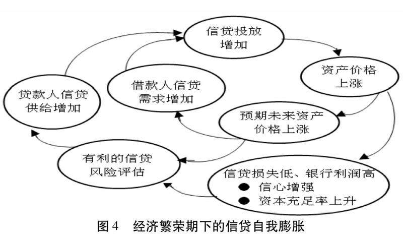 一个更值得关注的点是非理性信贷会在经济繁荣期自我膨胀,如图4所示。错误授信和过度授信的后果是引发资产价格泡沫,而价格泡沫又导致抵押物价值上升和放贷人乐观预期,这会进一步加大信贷投放激进度,即导致非理性信贷的自我强化。