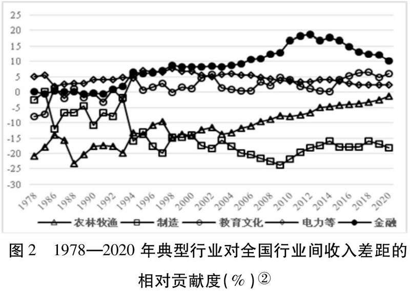 近些年来,金融行业持续在国民收入分配领域占据优势地位,成为造成行业间收入差距不断扩大的重要因素之一。首先,金融行业就业人员工资总额逐年增长,在国民收入分配占据的份额逐渐增大。如图1所示,我国金融行业城镇非私营单位就业人员工资总额逐年增长,对比全国水平,金融行业占据的份额整体呈现逐渐增大的趋势。同时这组数据可看出,2020年占比不到全国就业人员1%的金融行业获得了国民收入分配总份额的7%以上。这应引起国家和社会的足够警惕。其次,1994年开始金融业对中国行业间收入差距贡献度位居第一。如图2所示,1978—1991年间,金融业对行业间收入差距的贡献度微小。1992—2012年间,金融业对行业间收入差距的贡献度逐渐增大,其中,从1994年开始成为正贡献度最高的行业。