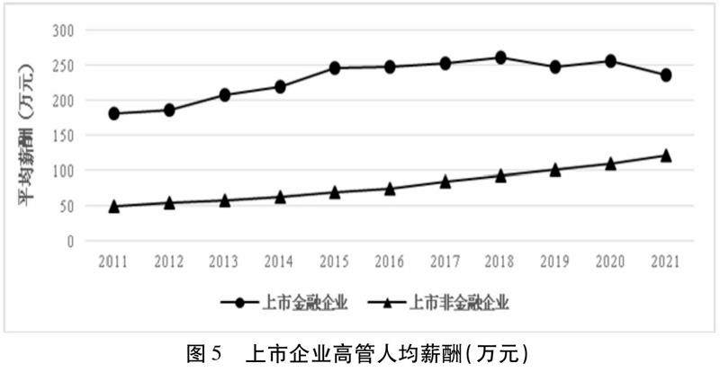 整體而言,2011—2021年,相对收入差距维持在2倍左右,绝对收入差距维持在116.20万—177.96万元区间。上市金融企业管理层的高薪现象是拉开金融行业与其他行业收入差距的重要原因之一。由此可见,金融行业收入仍处于国民经济收入分配的领先地位,其平均收入水平高于包括电力、采掘、交通等垄断性行业,也高于科学研究等知识密集型行业,更是远高于制造业、农林牧渔、建筑等劳动性密集型行业;尤其是金融行业高管的薪酬远高于其他行业,这是我国当前行业之间收入分配呈现出来的主要问题。