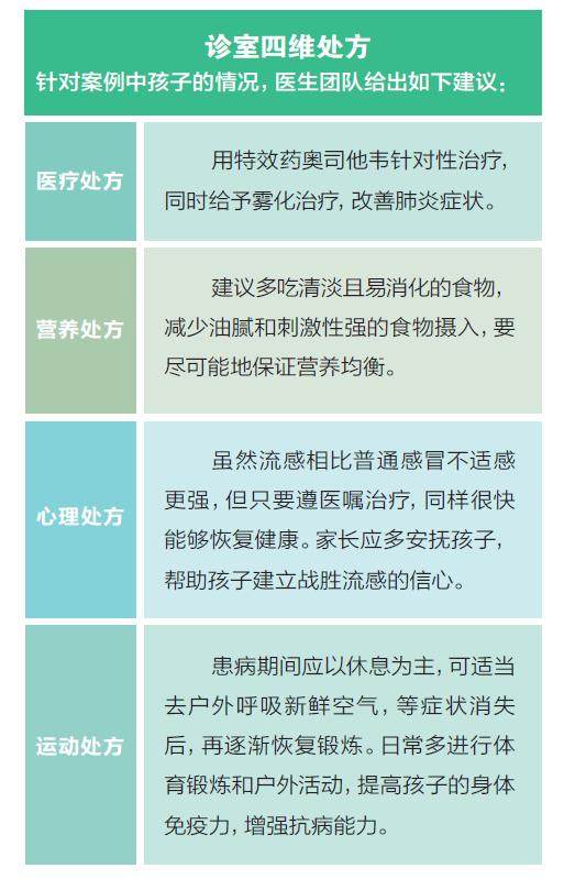 家长带着5岁的孩子来看病,孩子3天前感冒了,发烧2天,经常喊身上疼。刚开始家长以为孩子就是普通感冒,两三天就好了,所以没有特别在意。但家长发现孩子的精神越来越不好,很难退烧,而且咳嗽很厉害。经过详细问诊后发现,出现症状前,孩子曾在完全无防护的情况下在室内游乐场玩了大半天,而且今年没有接种流感疫苗。最后经检测,确诊孩子患了流感,并伴有轻症肺炎。