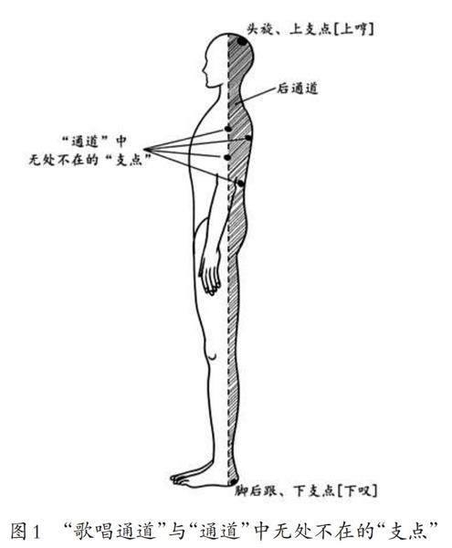 图中阴影部分为歌唱时所用的“后通道”,“上哼”(头旋位置)与“下叹”(脚后跟位置)构成“双支点”,“上哼”“下叹”与“通道”中无处不在的“支点”构成“三点一线”。