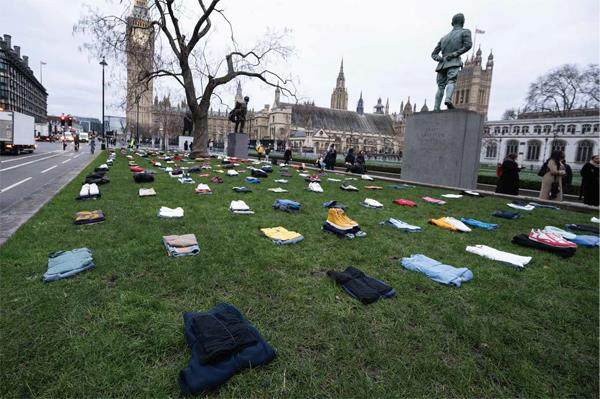 当地时间2024年1月8日,英国伦敦议会广场,一个由200多捆衣服组成的展览亮相。这些衣服代表着英国因暴力犯罪而失去的生命,该展览呼吁政府立即采取行动,防止严重的青少年暴力犯罪行为。